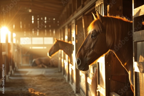 © Fitry, Fototapeta premium Morning sunlight streaming into a barn, illuminating horses as they gaze out of their stalls