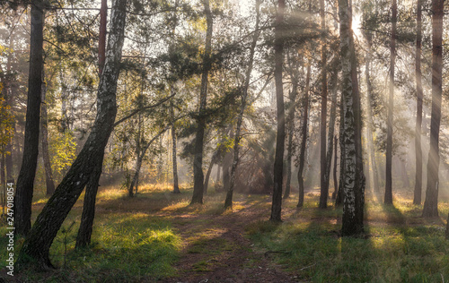Obraz premium Morning. Sunlight. Sun rays. Forest.
