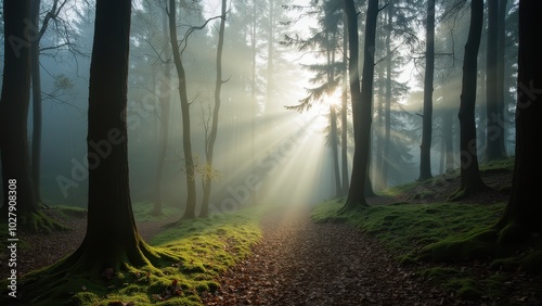 Naklejka premium Morning Sunlight Through Misty Forest Trees