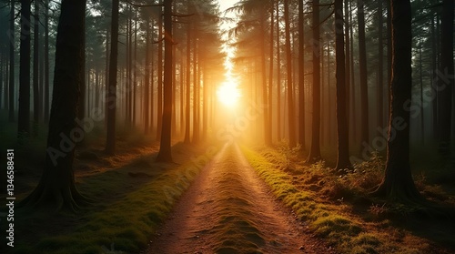 © TShirt Empire, Fototapeta premium Morning Sunlit Forest Path Golden Light Rays Serene Forest Landscape