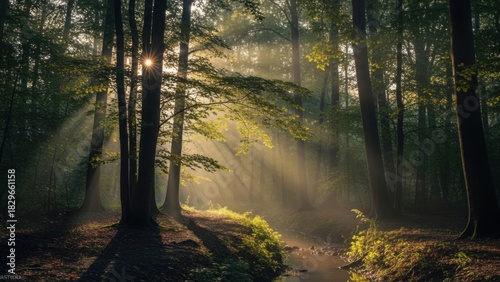 Obraz premium Morning Sunrays Illuminating a Tranquil Woodland Stream Scene