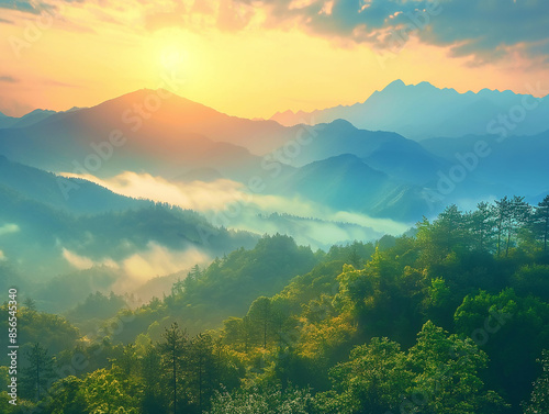 Obraz premium morning sunrise over a misty mountain range and forest.