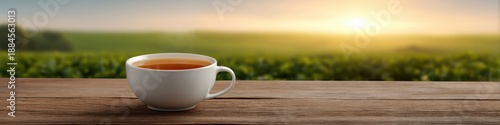 Fototapeta premium Morning sunrise over a tea field with a steaming cup on wooden table