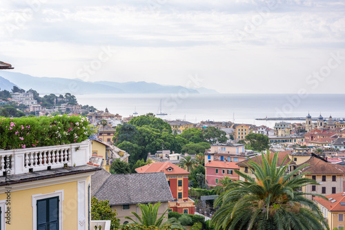 © frimufilms, Obraz premium Morning view from above to cloudy day in Santa Margherita Ligure city and sea in Italy. Balcony full of flowers.