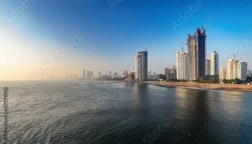 © Shelby, Obraz premium morning view of mumbai coastline with skyscrapers under construction and clear sky
