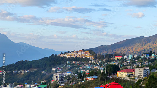 Fototapeta premium Morning View of Tawang Town and Monastery, Tawang, Arunachal Pradesh, India.