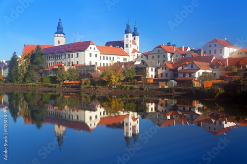 Fototapeta premium Morning view of Telc or Teltsch town mirroring in lake