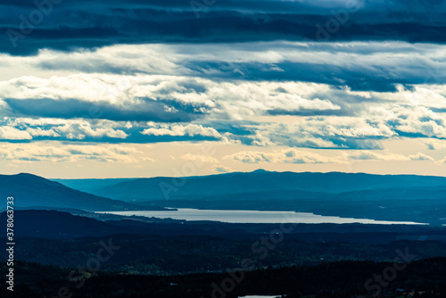 Fototapeta premium Morning view over Norwegian mountains with a large fjord in the distance.