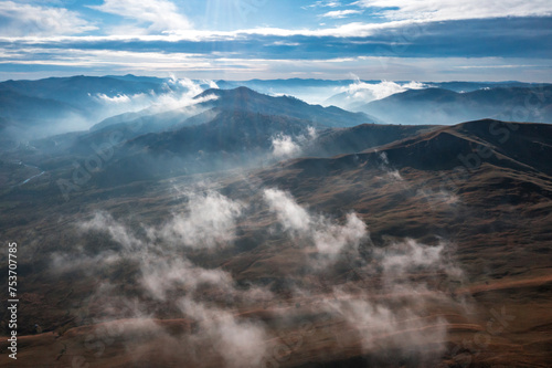 © Cristian Mihart, Fototapeta premium Morning view with mountain village and fog an clouds in Romania