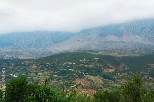 Naklejka premium Moroccan landscape with foggy mountains and fields.