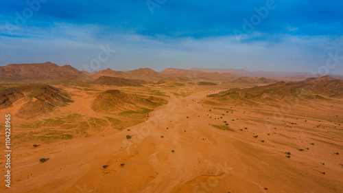 © LAHCENFOTOS, Fototapeta premium Moroccan Sahara Desert, ancient black volcanic mountains, the Sahara River Oued Ghris, stunning Acacia trees, wild camels, and desert camp, landscape where golden sand dunes merge with green plants