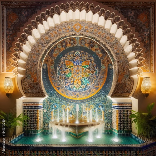 © Andrei, Obraz premium Moroccan zellige tile fountain pulses colored light synced to si