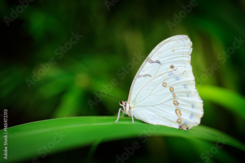 © ondrejprosicky, Naklejka premium Morpho polyphemus, the white morpho, white butterfly of Mexico and Central America. Big white butterfly, sitting on green leaves, Mexico. Tropic forest. Insect in the nature tropic habitat.