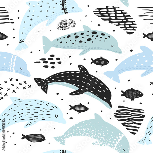 Obraz premium Morskie wzór z delfinami w dziecinnym stylu. Tło morskie stworzeń podwodnych...