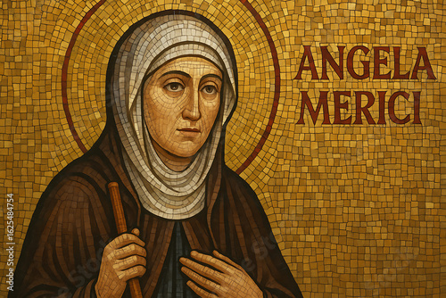 © shiva, Naklejka premium Mosaic portrait of Saint Angela Merici religious figure sacred art Catholic saint spiritual icon historical church background classical detailed tile pattern worship divine prayer holy Christian femal