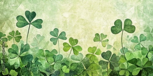 Fototapeta premium Mosaic shamrock leaves in varying shades of green scattered across a textured...