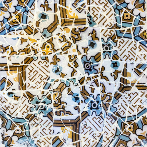 Fototapeta premium mosaic tile, decoration, broken glass, Park Guell, Barcelona, Spain. Designed by Gaudi
