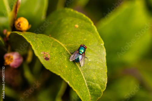© CarlosHerreros, Naklejka premium Mosca posada en la hoja de un limonero.