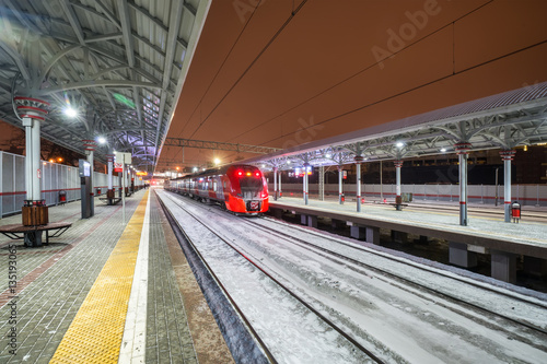 © Media_Works, Fototapeta premium Moscow central circle railway station at night time without people. Russia.