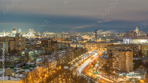 Obraz premium Moscow city Russia skyline aerial panoramic top view day to night timelapse urban winter snow scenery architecture background