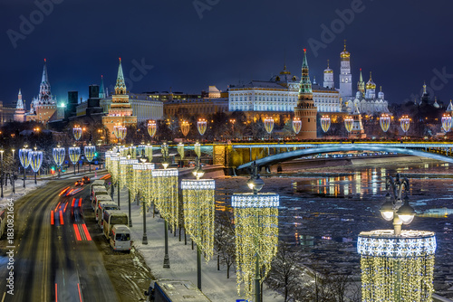 Obraz premium Moscow Kremlin, embankment of Moscow River with Christmas decoration at night...