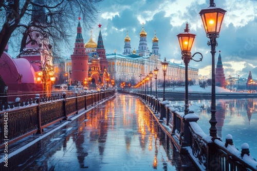 © Trionorejo, Fototapeta premium Moscow Kremlin winter twilight, reflection, snowy walkway