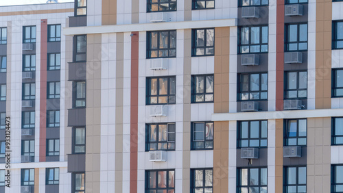 © Антон Скрипачев, Fototapeta premium Moscow, March 19 2024, A large building with many windows and a clear blue sky in the background. The building is tall and has a modern look