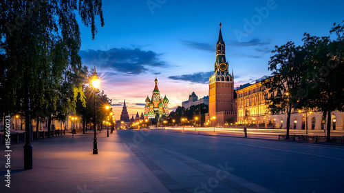 Naklejka premium Moscow Red Square sunrise, empty street, Kremlin view, travel photography.