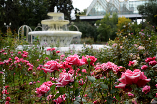 © kcuxen, Fototapeta premium Moscow, Russia - August 21, 2019: Close-up of pink roses against the fountain in the Rose Garden in Gorky Park