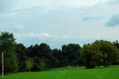 © Alexandra, Naklejka premium Moscow Russia - 07 26 2019: group of people running workout in Kolomenskoye Park on cloudy summer day.
