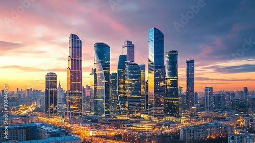 © Galib, Fototapeta premium Moscow skyline with skyscrapers at sunset.