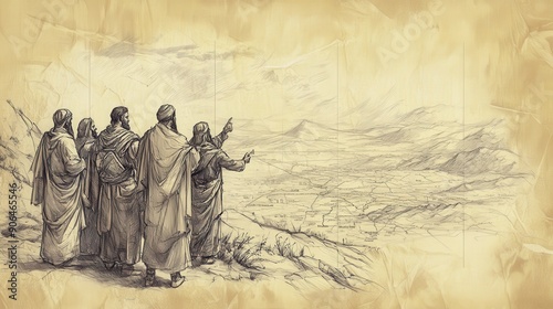 © T Studio, Fototapeta premium Moses and Leaders Gathered Around a Map of Canaan, Biblical Illustration from Numbers, The Boundaries of Canaan, Beige Background, Ideal for Religious Education and Worship Materials