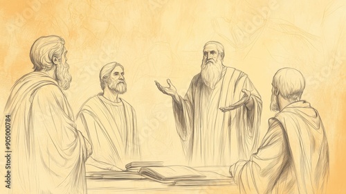 © T Studio, Fototapeta premium Moses Explaining God's Laws to New Judges, Jethro Nodding Approvingly in Background - Biblical Illustration, Bible Wall Art, Beige Background - Exodus Jethro's Visit