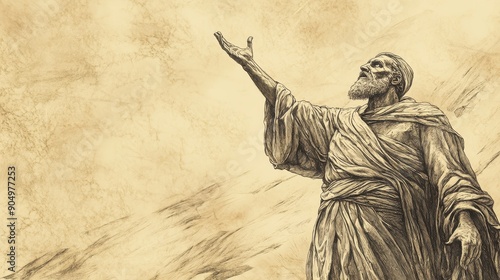 Fototapeta premium Moses Raising His Hand, Darkness Falls Over Egypt - Biblical Illustration, Bible Wall Art, Beige Background - Exodus Plagues of Locusts and Darkness