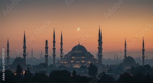Naklejka premium Mosque at Dusk A Serene Skyline Silhouette with a Crescent Moon, Capturing the Beauty and Tranquility of Islamic Architecture