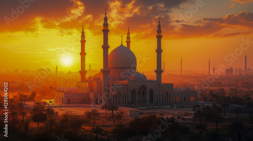 © Rajesh, Obraz premium Mosque at sunset against a desert cityscape, enveloped in warm light creating a calm atmosphere