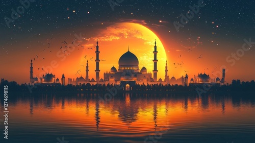 © afif, Fototapeta premium Mosque at sunset, moonlit night, cityscape reflection. Ideal for travel, religious themes