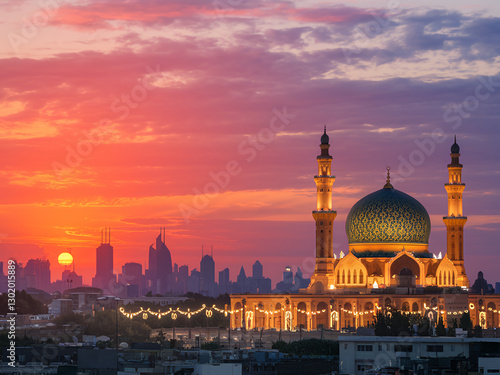 © NOVA ELiON, Fototapeta premium Mosque at Sunset with Vibrant Sky and Reflection
