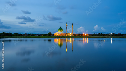 Naklejka premium Mosque illuminated at dusk with reflection in a calm body of water Islamic...