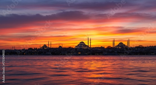 © bilal, Fototapeta premium Mosque, Istanbul evening, water, sunset, night, sky, sea, river, city, sun, clouds, sunrise, lake, ocean, bridge, travel, red, harbor, boat, nature