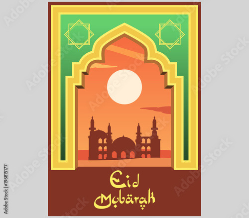 Naklejka premium Mosque Silhouette At Gold Green Door Frame