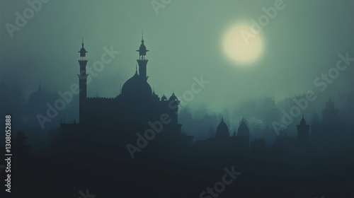 Fototapeta premium Mosque silhouette, misty dawn, city skyline, peaceful scene