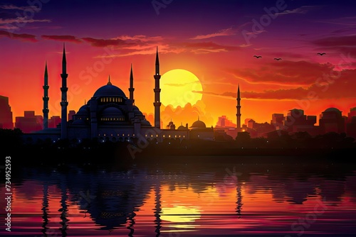 © Jahan Mirovi, Fototapeta premium Mosque sunset sky, moon. Silhouette of the mosque at sunset background. panaromic islamic wallpaper. Silhouette mosques on dusk sky twilight. Ramadan Kareem background.
