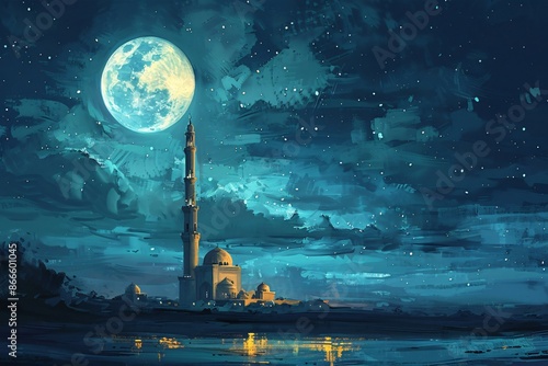 Obraz premium Mosque Under a Full Moon and Starry Sky