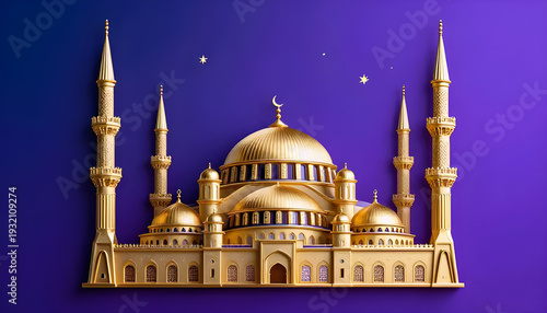 © AiMagic, Fototapeta premium Mosque with Crescent Moon and Stars — Islamic Festival Celebration Illustration