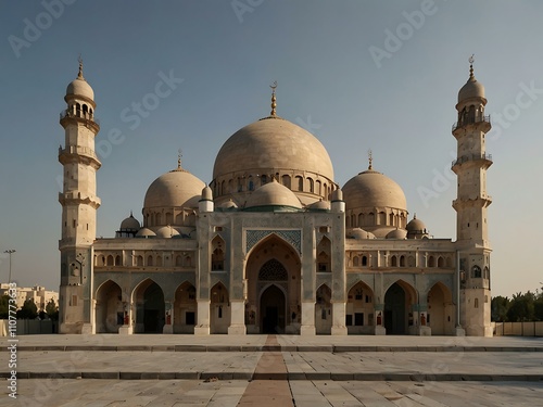 Fototapeta premium Mosque with symmetrical domes and minarets.