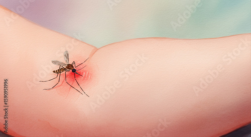 © Andrey, Obraz premium mosquito bite on baby’s arm. Mosquito feeding on human skin with visible red bite reaction
