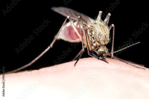 © devaul, Naklejka premium Mosquito Sucking Blood. Close-up on a Black Background