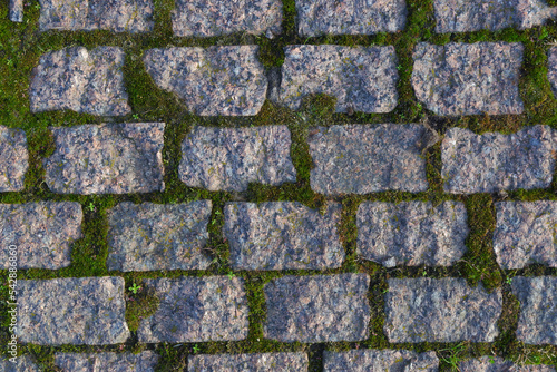 Fototapeta premium Moss between paving blocks. Paving slabs. Old paving stones