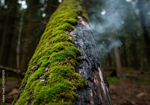 © justsann, Naklejka premium Moss Covered Burnt Tree Log with Smoke in Forest Environment
